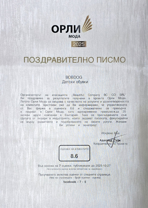 Много съм впечатлена! Всичко видяно и прочетено в сайта, абсолютно отговаря. Красиви, леки и много удобни, детвто ми се влюби в тях! Със сигурност ще поръчаме отново!